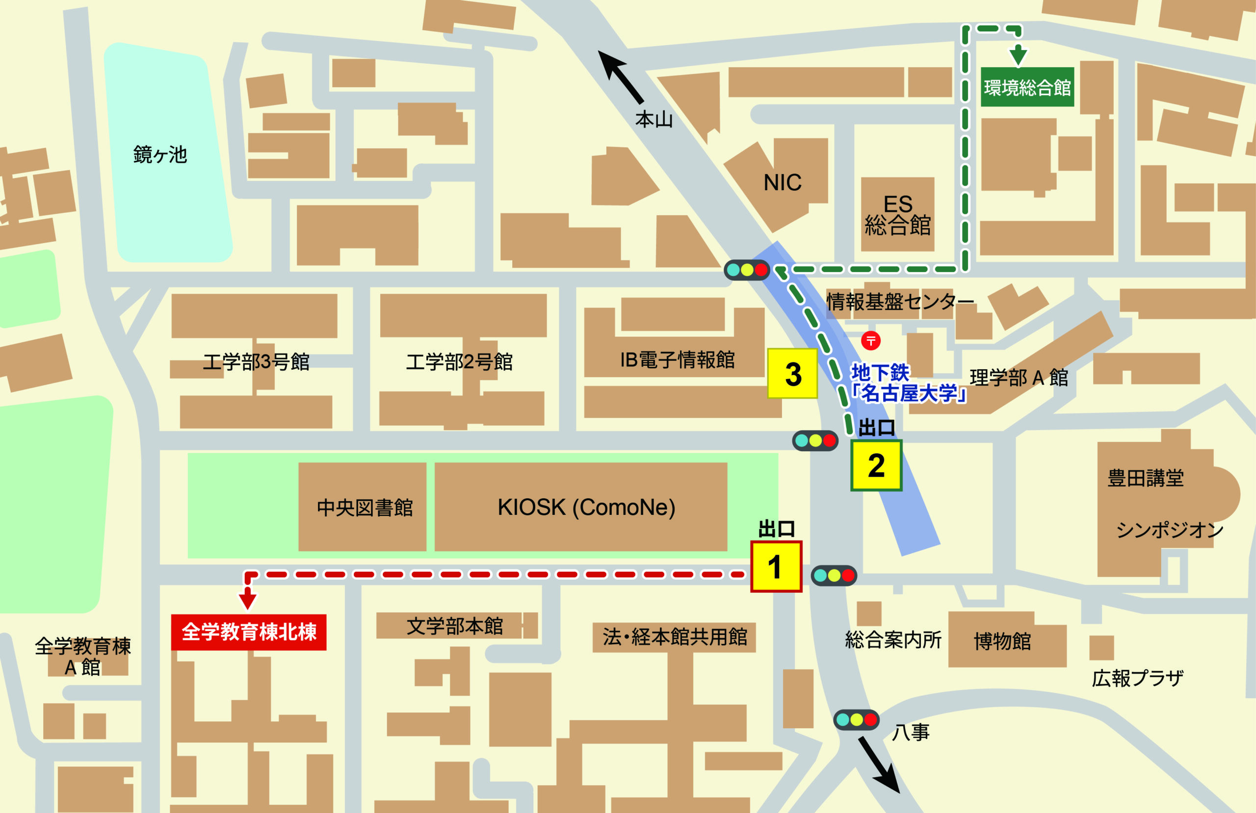 全学教育棟(北棟)へは地下鉄名城線「名古屋大学」駅 1番出口から赤点線に沿ってお越しください。