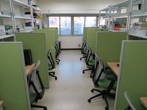 経済環境論講座の研究室と院生室、演習室は全学教育棟に位置しています。院生室では学生が個別に机や椅子などを使用できます。演習室ではプロジェクターを利用することができます。インターネットもストレスなく使用できます。